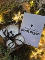 Zet bij bestelnotities welke kleuren waxinelichtjes je wilt bijvoorbeeld: 1x klein groen, 1x klein cognac en 1x groot luipaard, of één kleur kan natuurlijk ook! Kies een kaart en vul in welke tekst er op het kaartje mag en ik regel de rest!